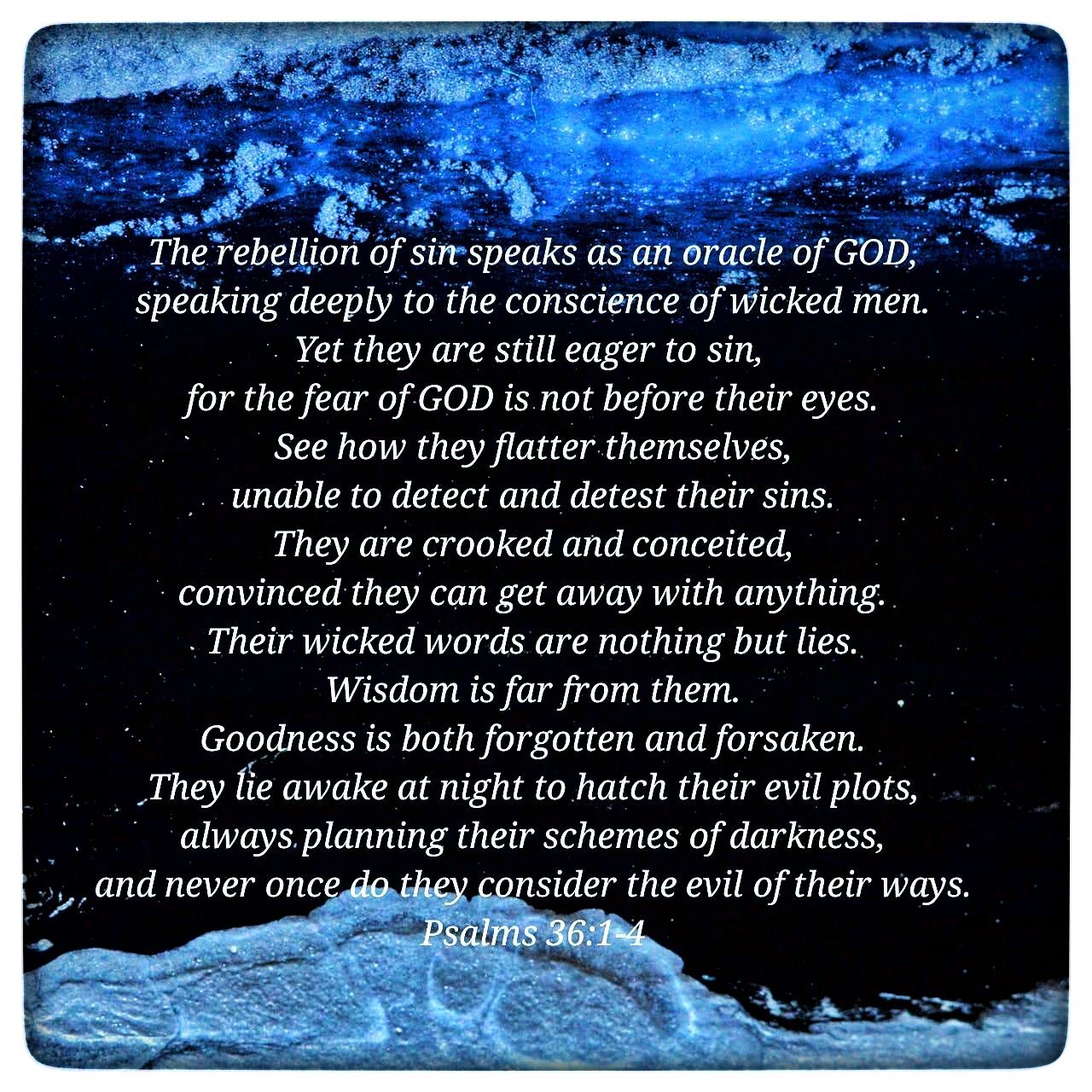 The rebellion of sin speaks as an oracle of GOD, speaking deeply to the conscience of wicked men. Yet they are still eager to sin, for the fear of GOD is not before their eyes. See how they flatter themselves, unable to detect and detest their sins. They are crooked and conceited, convinced they can get away with anything. Their wicked words are nothing but lies. Wisdom is far from them. Goodness is both forgotten and forsaken. They lie awake at night to hatch their evil plots, always planning their schemes of darkness, and never once do they consider the evil of their ways.