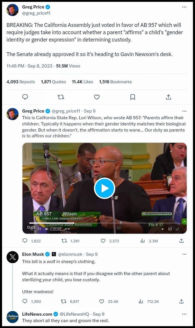 If fully approved, an ex/divorcee/separated spouse living in California can claim custody of children by accusing their ex in another state of being against their child's desires. There are twisted parents who will do anything to secure custody of children in divorce battles - including brainwashing their child to a forced gender change or prime them to desire surgery.